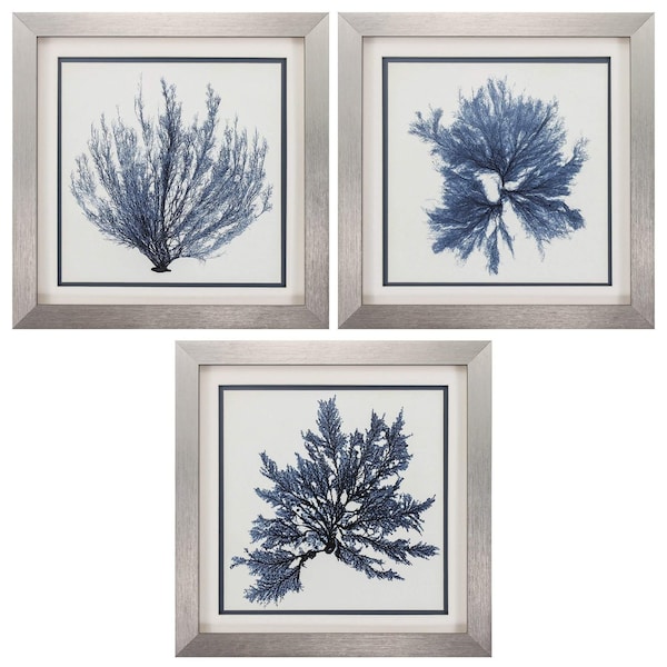 22" X 22" Silver Frame Coastal Seaweed, Set Of 3, 3PK