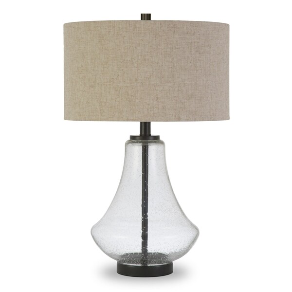 Bring of level of elegance and freshness to your space with this high quality 23-inch black glass table lamp with flax drum shade. The lamp is made of sturdy glass and features a black color. Includes a flax fabric, drum shaped shade, making this a fashionable piece that will complement most any interior. This standard table lamp is designed to provide general lighting to the area. Use this lamp anywhere and elevate the look of the whole space. It is perfect for virtually any decor. 23-inch H x 15-inch W x 15-inch D