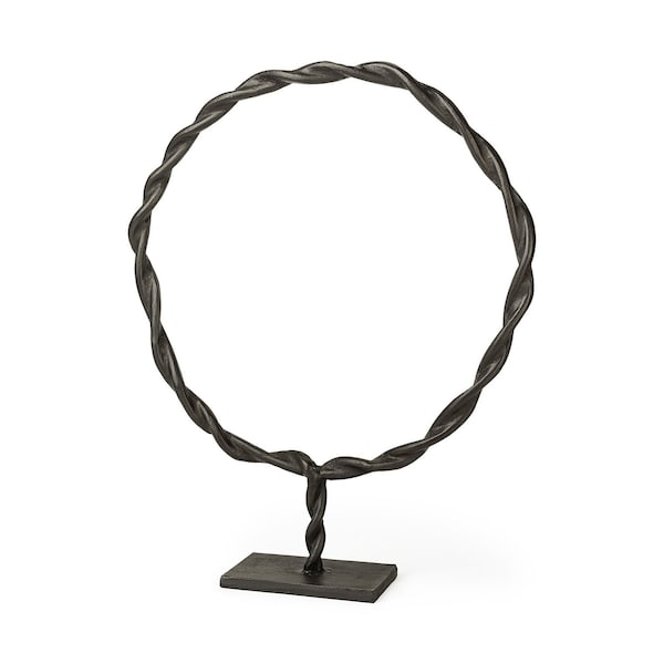 Unique and decorative, this 23-inch black metal round braided tabletop sculpture will leave a lasting impression. Crafted from high-quality metal, this sculpture embodies an industrial style that enhances any space. This decor piece is made from solid metal and has a matte black finish on top of it. There is a small black square base that has a circular shape in a braided design sitting on top of it. Perfect for coffee tables, bookshelves, or entryways, it serves as a striking centerpiece sure to captivate guests. Use alone for a bold statement or as part of a curated display to elevate your home decor. 23-inch h x 19-inch w x 4-inch d.