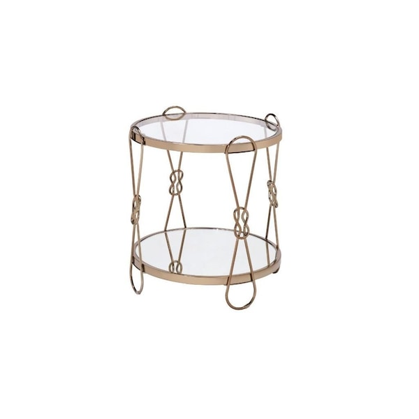 Optimize your space and add some charm to your room with the 23" gold mirrored and metal round end table with shelf. Help to keep your space organized with the included single shelf. An ideal location for placing your snacks and drinks, and a place to keep your lamp, frames, or other accessories. You can also use it as an entryway table to hold your keys. 23" H x 20" W x 20" D