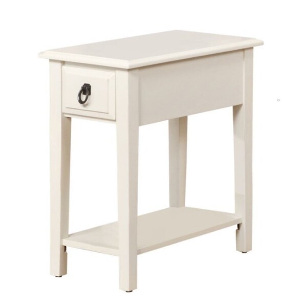 Optimize your space and add some charm to your room with the 23-inch white wood end table with drawer and magazine holder. This table features quality construction from solid and manufactured wood and an updated monotone color scheme with white as the main color on both the top and the base. Help to keep your space organized with the included single shelf. Includes a single easy pull out drawer for handy storage of life's little essentials. Side tables are a great way to flank your sofa, use as an accent next to your favorite chair, or can even be used bedside. You can also use it as an entryway table to hold your keys. 23.00-inch h x 12.00-inch w x 22.00-inch d.