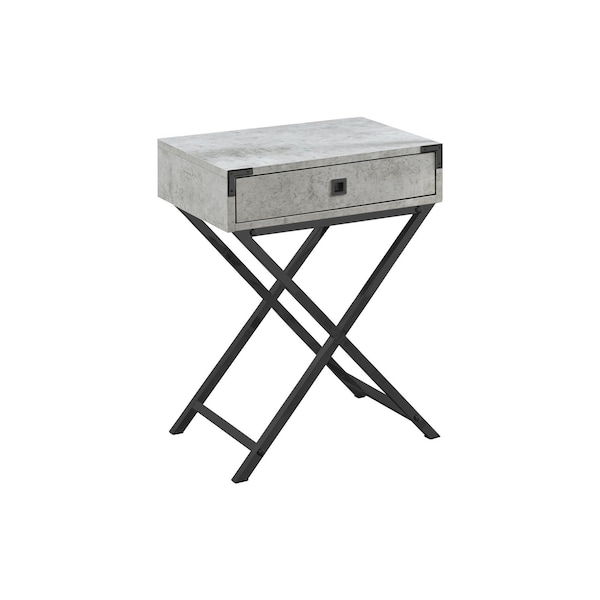 Show off your exquisite taste with this 24-inch black and gray end table with drawer. A black metal frame is finished off with a gray manufactured wood top that is the epitome of quality construction and design. Includes a single easy pull out drawer for handy storage of life's little essentials. A great accent on either side of the sofa or bed, this adorable end or side table is just what you need. You can also use it as an entryway table to hold your keys. 24-inch H x 12-inch W x 18.25-inch D