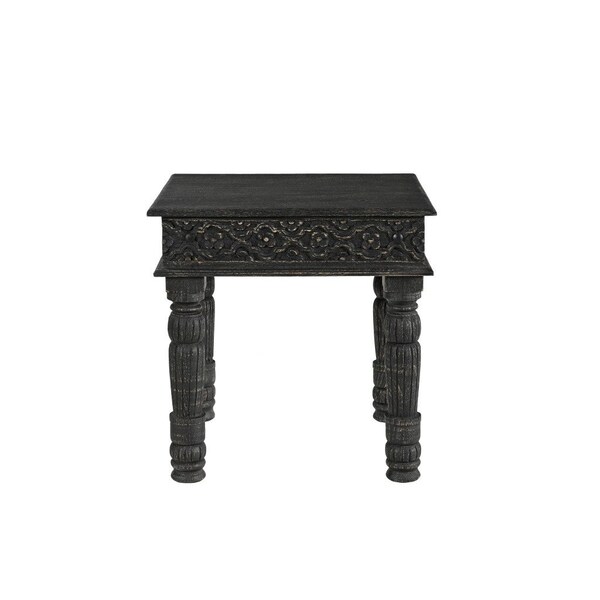 Distinctive in style the 24-inch black carved solid wood end table radiates a versatile charm. Made of solid wood, the black coloration throughout gives this piece an updated and refreshing look. The carving shows true artistry while the purposefully distressed finish gives this table an authentically rustic feel. An ideal location for placing your snacks and drinks, and a place to keep your lamp, frames, or other accessories. You can also use it as an entryway table to hold your keys. 24-inch H x 24-inch W x 22-inch D