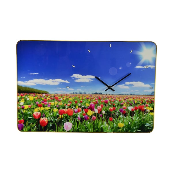 This 24-inch blue red and gold solid wood and acrylic silent tulips floral wall clock includes three moving hands on the face that move smoothly to indicate the hour, minute and seconds. Features a practical, curved-edged rectangle shape and a vibrant field of tulips design. The clock face not only looks good but is made from sturdy acrylic that will stand the test of time. Elevate the decor of any room in your house. With its unique design and practical purpose, this clock will add flair to your home while also acting as an essential tool. 15.5-inch h x 23.5-inch w x 1.5-inch d.