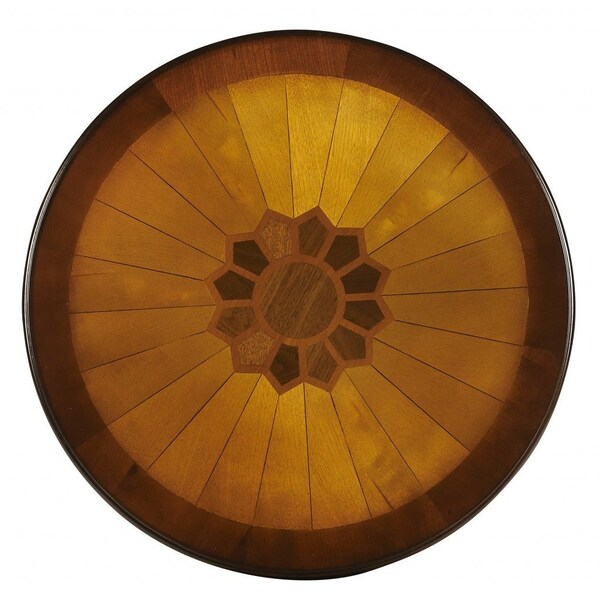 Show off your exquisite taste with this 24-inch brown solid wood round end table with drawer. A classic design that is updated with a beautiful and unique cherry and maple geometric inlay on the tabletop. It features elegantly tapered legs and a drawer that further add to the beauty and convenience of this side table. The antiqued brass drawer pull adds to the classic traditional beauty of this piece. Crafted from a mix solid wood, MDF, and veneers this table is not only good looking but built to last. Side tables are a great way to flank your sofa, use as an accent next to your favorite chair, or can even be used bedside. You can also use it as an entryway table to hold your keys. 24.00-inch h x 20.00-inch w x 20.00-inch d.