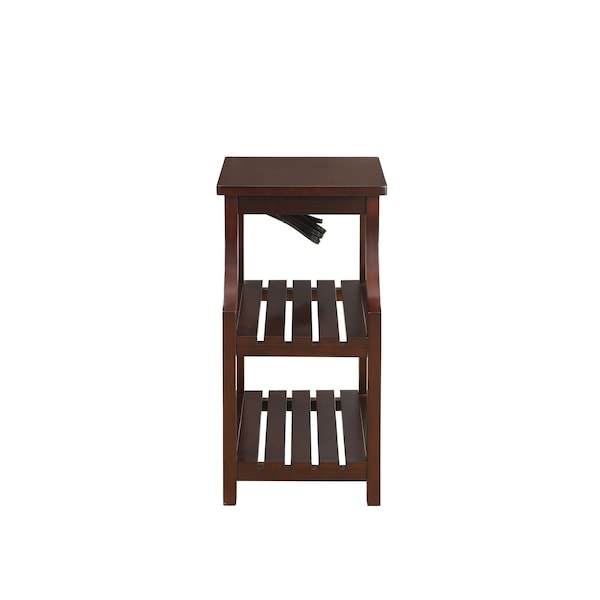 Show off your exquisite taste with this 24-inch brown wood end table with two shelves and USB port. The brown coloration runs throughout this good looking solid wood and manufactured wood table. Includes 2 slat panel shelves for additional storage or display space. The addition of USB connectors helps you to keep your devices charged and ready. A great accent on either side of the sofa or bed, this versatile end or side table is just what you need. This versatile table is a great accent for most any room. 24-inch h x 13-inch w x 20-inch d.