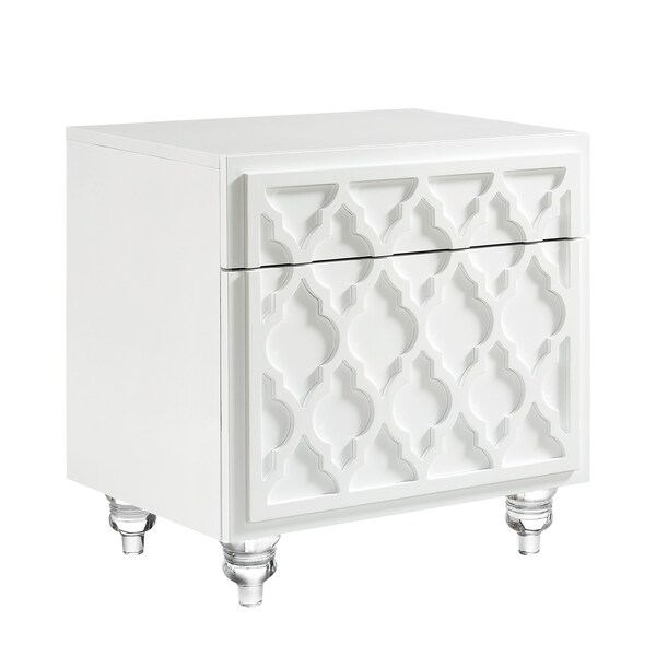 Show off your exquisite taste with this 24-inch clear and white end table with drawer and shelf. The top of this manufactured wood table is white, while the base is a nice compliment in clear. Help to keep your space organized with the included single shelf. Includes a single easy pull out drawer for handy storage of life's little essentials. A great accent on either side of the sofa or bed, this adorable end or side table is just what you need. This versatile table is a great accent for most any room. 24-inch H x 24-inch W x 18-inch D