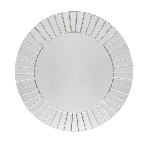 If you want to add some brightness to your living space, the 24-inch clear round beveled glass framed accent mirror is perfect for you. The round shaped mirror is surrounded by small mirrored planks that adds a nice touch of depth and texture to your space. Its contemporary style makes this mirror a favorite for bringing some flair to your decor. This unique mirror will look great as part of your existing wall decor or you can use it as a statement piece anywhere in your home. 23.6-inch H x 23.6-inch W x 0.8-inch D