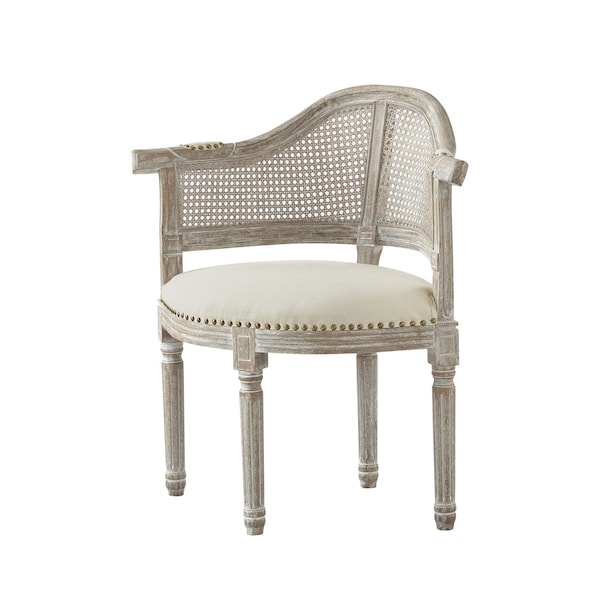 Give your living room, bedroom, or office a facelift with this beautifully crafted 24-inch cream and beige linen arm chair. This sturdy linen upholstered arm chair comes in a chic solid cream color to give your space just the right look. Giving the chair stability and structure, the inner frame is constructed with high quality solid wood and features a cushion back that comes complete with soft and comfortable cushioning. Nailhead trim gives this chair a refined look that adds additional texture and visual interest. 33.3-inch h x 23.6-inch w x 30.5-inch d.