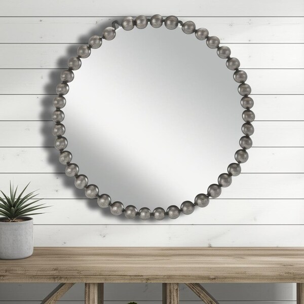 The carefully crafted 24-inch dark gray beaded metal round accent mirror is what you need to add finishing touch to your decor. Framed with iron in a classic beaded pearl geometric design, this mirror will bring practical application and fashionable design to your space, adding some casual flair to your decor. This mirror will be a great useful addition to your home but will also help elevate the space in the room. Produced with premium quality glass for a beautiful reflection, this mirror will provide an exceptional visual experience. 23.6-inch h x 23.6-inch w x 1.65-inch d.