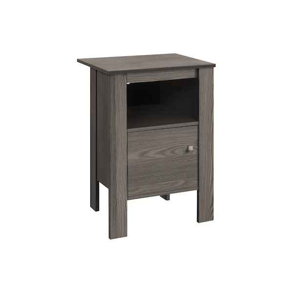 Distinctive in style the 24-inch gray end table with shelf radiates a versatile charm. This table features quality construction from manufactured wood and an updated monotone color scheme with gray as the main color on both the top and the base. Includes a single shelf for handy storage or display space. Side tables are a great way to flank your sofa, use as an accent next to your favorite chair, or can even be used bedside. This versatile table is a great accent for most any room. 24.25-inch H x 14-inch W x 17.25-inch D