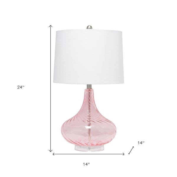 This 24-inch pink and clear glass novelty table lamp with white drum shade is the perfect combination of design and function. The base of this lamp is made of pink and clear glass. The white shade has a drum shape and is made from fabric. This standard table lamp is designed to provide general lighting to the area. The light that this lamp throws is soft and warm to elevate the look of most any space in your home. It is perfect for virtually any decor. 24.00-inch h x 14.00-inch w x 14.00-inch d.