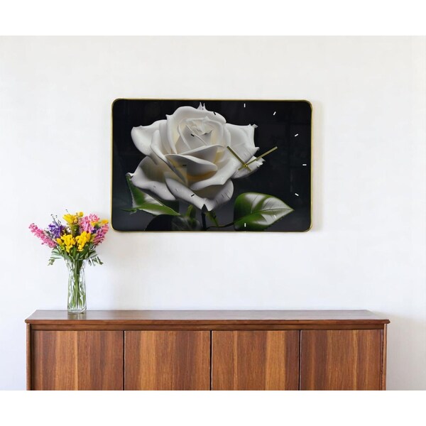 This 24-inch white black and green solid wood and acrylic silent roses floral wall clock includes three moving hands on the face that move smoothly to indicate the hour, minute and seconds. Features a practical, curved-edged rectangle shape and a contemporary white roses printed design. The clock face not only looks good but is made from sturdy acrylic that will stand the test of time. Elevate the decor of any room in your house. The eye-catching makeup of this clock will ensure that you never run late again. 15.5-inch h x 23.5-inch w x 1.5-inch d.