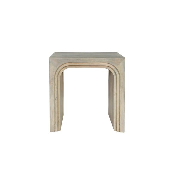 Optimize your space and add some charm to your room with the 24-inch white solid wood square sled end table. This table features quality construction from solid wood with an updated monotone color scheme with white as the main color on both the top and the base. This stylish and unique rectangular table features unique fluted textural layers for visual interest and will be a great location for placing your snacks and drinks, and a place to keep your lamp, frames, or other accessories. This versatile table is a great accent for most any room. 24-inch h x 24-inch w x 24-inch d.