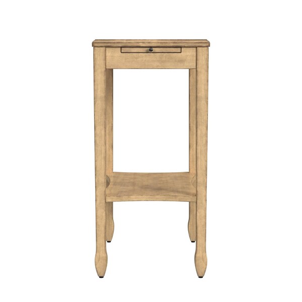 Show off your exquisite taste with this 25" beige manufactured wood rectangular end table with shelf. A solid beige solid and manufactured wood frame is finished off with a matching beige manufactured wood seat, giving this table a chic monotone look. Complete with a purposefully distressed finish, this table has an aged, vintage, and rustic feel. Help to keep your space organized with the included single shelf. A great accent on either side of the sofa or bed, this adorable end or side table is just what you need. You can match it with other pieces to get the ideal look for your place. 25" H x 12" W x 18" D