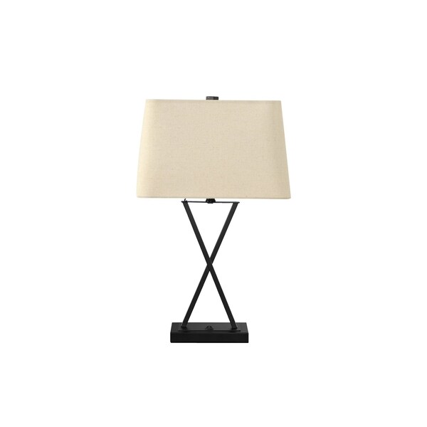 Embrace the good life with this hard working and stylish 25-inch black metal geometric usb table lamp with beige shade. The base of this lamp is made of black metal. The beige rectangular linen shade is a great compliment to this lamp. This standard table lamp is designed to provide general lighting to the area. Use this lamp anywhere and elevate the look of the whole space. The perfect lamp to create just the right natural and soothing light in your space. 24.5-inch H x 15-inch W x 10-inch D