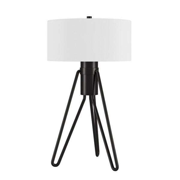 Truly a mix of design and functionality that doesn't compromise on style, this 25-inch black metal two light tripod table lamp with white drum shade will be a great addition to your space. The lamp is made of sturdy metal and features a black color. The white shade has a drum shape and is made of fabric, which makes it a perfect choice. A tripod base gives this lamp a unique and modern profile. Use this lamp anywhere and elevate the look of the whole space. It is perfect for virtually any decor. 25-inch H x 15-inch W x 15-inch D