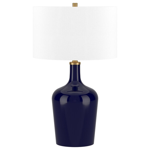 Add a bright anchor to your room with this 25-inch blue glass urn table lamp with white drum shade. The base of this lamp is made of glass finished in a blue tone. The white drum fabric shade is finishes this piece off nicely and symmetrically this standard table lamp is designed to provide general lighting to the area. The light that this lamp throws is soft and warm to elevate the look of most any space in your home. The perfect lamp to create just the right natural and soothing light in your space. 25-inch H x 15-inch W x 15-inch D