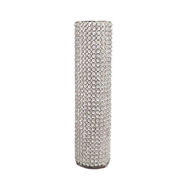 The 25-inch clear and silver faux crystal and metal table vase is a stunning addition to any decor. Designed in a sleek cylinder shape, this vase effortlessly enhances modern interiors. Made from high-quality faux crystal and metal, it combines elegance with durability. The sparkling crystals embedded within bring a touch of glamour, making it perfect for weddings or other special occasions. Its versatile design allows it to complement various styles while serving as a captivating centerpiece on your table. Add this exquisite vase to elevate your home decor and create an inviting atmosphere for your guests. 24.75-inch h x 6.25-inch w x 6.25-inch d.