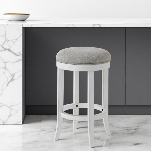 Comfortable enough to sit in for awhile, this 25-inch gray and antiqued white solid wood swivel backless counter height bar chair will transcend the look of your room. A backless mixed with a round shaped seat makes this chair both comfortable and fashionable. Designed with a footrest for comfort and convenience. 25-inch H x 17-inch W x 17-inch D