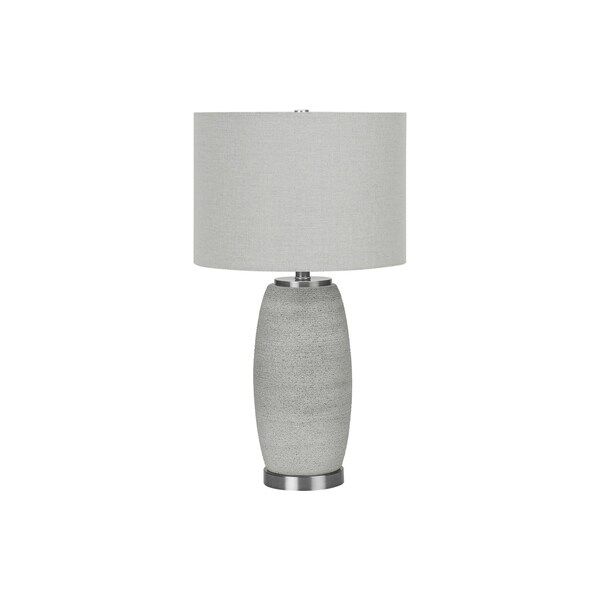 This 25-inch gray and silver ceramic cylinder table lamp with gray drum shade is the perfect combination of design and function. The lamp is made of sturdy ceramic and features a gray and silver color. The gray shade has a drum shape and is made of linen, which makes it a perfect choice. This standard table lamp is designed to provide general lighting to the area. The light that this lamp throws is soft and warm to elevate the look of most any space in your home. Bring some lite and good vibes into your space with this updated and stylishly designed lamp. 25-inch H x 14-inch W x 14-inch D