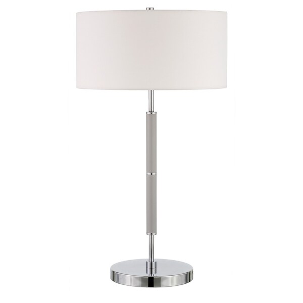 Add a bright anchor to your room with this 25-inch gray metal two light table lamp with white drum shade. The base of this lamp is made of metal finished in a gray tone. Includes a white fabric, drum shaped shade, making this a fashionable piece that will complement most any interior. This standard table lamp is designed to provide general lighting to the area. The light that this lamp throws is soft and warm to elevate the look of most any space in your home. It is perfect for virtually any decor. 25-inch H x 14-inch W x 14-inch D