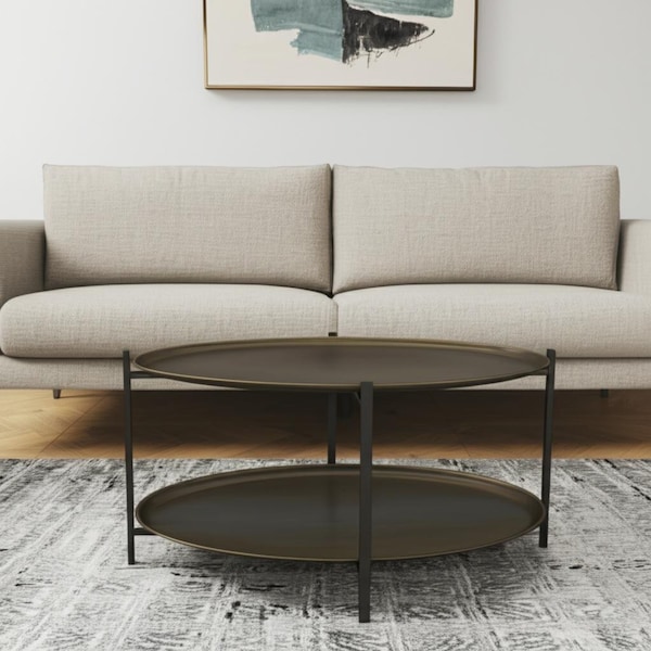 Give your living room, family room, or office the perfect anchor piece with this 26-inch antiqued bronze and black steel oval two tier coffee table. The top and shelf of this steel table is antiqued bronze, while the legs and base is a nice compliment in black. Includes a single shelf for handy storage or display space. This oval table is an updated take on a classic. If you're looking for something that can fit into a living area, bedroom, or office, this coffee table is for you. 17.70-inch h x 26.00-inch w x 18.00-inch d.