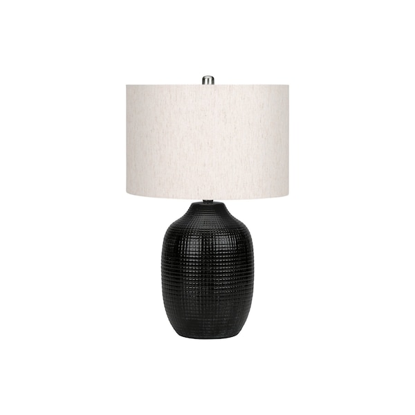 Truly a mix of design and functionality that doesn't compromise on style, this 26-inch black ceramic urn table lamp with ivory drum shade will be a great addition to your space. The base of this lamp is made of ceramic finished in a gorgeous black glaze that features a geometric textural design. Includes a ivory linen, drum shaped shade, making this a fashionable piece that will complement most any interior. This standard table lamp is designed to provide general lighting to the area. Use this lamp anywhere and elevate the look of the whole space. The perfect lamp to create just the right natural and soothing light in your space. 25.75-inch H x 16-inch W x 16-inch D
