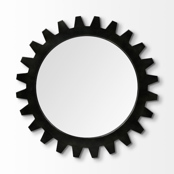 Artisan crafted resembling a cog, this 26" Black COG Round Metal Frame Wall Mirror will add noticeable variation to your space. Whether used alone or paired with other mirrors, this accent makes a huge difference in your decor. it is held in a dark metal frame; add it to any room and enjoy the exceptional sparkle that ships with it. dimensions: 26".