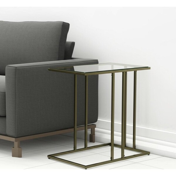 Distinctive in style the 26-inch clear and antiqued gold glass and iron frame end table radiates a versatile charm. The clear glass top of this table is a nice contrast to the high quality, antiqued gold iron of the base. A great accent on either side of the sofa or bed, this adorable end or side table is just what you need. This versatile table is a great accent for most any room. 26-inch h x 12.75-inch w x 23.5-inch d.