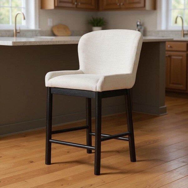 The perfect way to add some extra seating in your home, this 26-inch white and black fabric and solid wood counter height bar chair will elevate the look and vibe of your room. The white upholstered seat of this stool is a nice contrast to the high quality, black solid wood of the base. The armchair design gives you a great place to comfortably rest your arms. Not only good looking and stylish, this chair features a square shaped seat and a full back for the ultimate in comfort and enjoyment. 39.76-inch h x 22.83-inch w x 21.65-inch d.