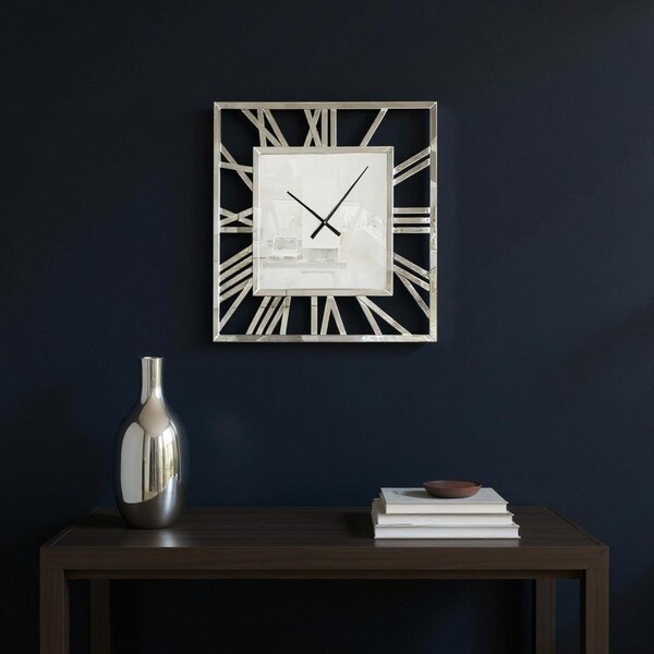 This 27-inch silver mirrored glass silent analog square wall clock includes three moving hands on the face that move smoothly without numbers on the face to indicate the hour, minute and seconds. Features a practical, straight-edged square shape with roman numerals as part of the outer frame to give this piece a striking modern and contemporary look. Elevate the decor of any room in your house. The eye-catching makeup of this clock will ensure that you never run late again. 27-inch h x 27-inch w x 5-inch d.