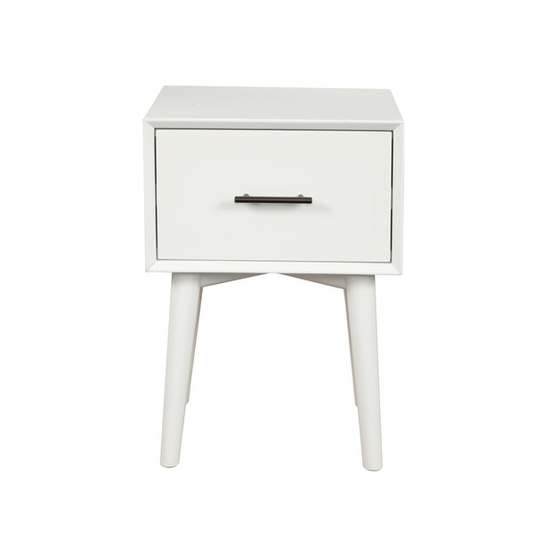 Distinctive in style the 27" white solid manufactured wood end table with drawer radiates a versatile charm. Made of solid manufactured wood, the white coloration throughout gives this piece an updated and refreshing look. Includes a single easy pull out drawer for handy storage of life's little essentials. A great accent on either side of the sofa or bed, this adorable end or side table is just what you need. You can also use it as an entryway table to hold your keys. 26.5" H x 18" W x 15" D