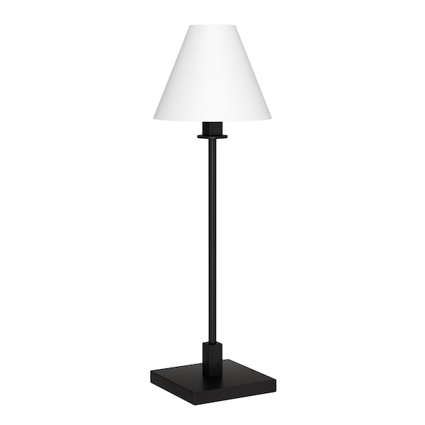 With this 28-inch black metal candlestick table lamp with white cone shade you can bring in design to any space along with adding some ambient lighting. A gorgeous black metal base brings just the right amount of pizzazz to this fabulous lamp. Includes a white fabric, cone shaped shade, making this a fashionable piece that will complement most any interior. This standard table lamp is designed to provide general lighting to the area. High quality design makes this a great lamp for not only lighting, but accenting a room with style. Bring some lite and good vibes into your space with this updated and stylishly designed lamp. 28-inch H x 9-inch W x 9-inch D