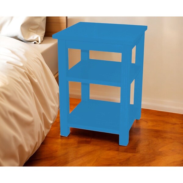 Good looking design and practical styling meet to form this 28-inch blue solid wood nightstand. Made of high quality solid wood that is built to last. 2 shelves are included for you to have additional storage and display space. The unsung hero of the bedroom, this nightstand is perfect for keeping a glass of water, lamp, alarm clock, jewelry, and more, close by and easily accessible. Versatile in use this nightstand would also work as a great end table in the living room, hallway, or office. 28-inch h x 20-inch w x 20-inch d.