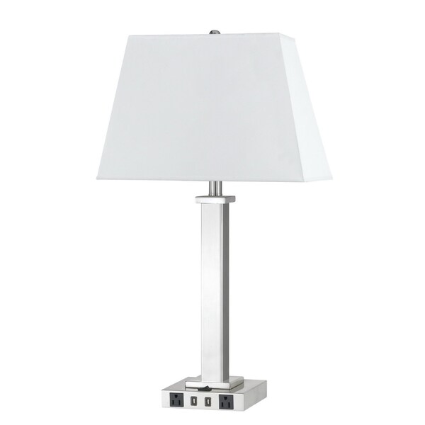 This 28-inch nickel metal usb table lamp with white shade is the perfect combination of design and function. The base of this lamp is a column made of metal finished in a nickel tone in a shiny and smooth finish. The white shade has a rectangular shape and is made of linen, which makes it a perfect choice. This standard table lamp is designed to provide general lighting to the area. High quality design makes this a great lamp for not only lighting, but accenting a room with style. It is perfect for virtually any decor. 28-inch H x 12-inch W x 16-inch D