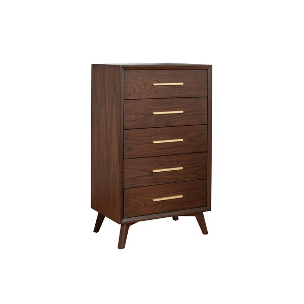 This 28" walnut solid wood five drawer standard chest is a practical and good looking accent for your bedroom storage and organizational needs. The space saving design of this standard chest makes it a great choice for space challenged spaces or small walls within your room. Equipped with five easy open drawers for practical and good looking clothing storage. This dresser is built to last from high quality solid wood,. 47" H x 28" W x 18" D