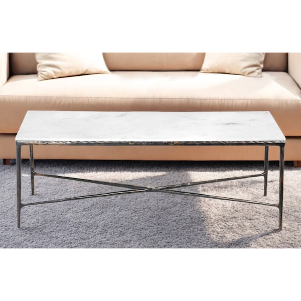 This stylish 28-inch white and brown genuine marble and aluminum coffee table is not only practical, but good looking and built to last. This handmade table features a rustic and distressed aluminum frame that is finished off with a white genuine marble top. The epitome of quality construction and design, this rectangular table is an classic yet updated way to accent your room. If you're looking for something that can fit into a living area, bedroom, or office, this coffee table is for you. 18-inch H x 28-inch W x 52-inch D