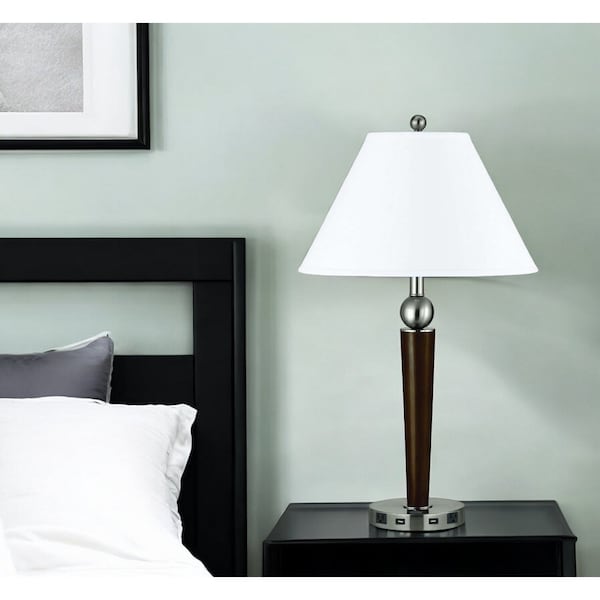 This 29-inch nickel metal geometric usb table lamp with white empire shade is the perfect combination of design and function. The base of this lamp is made of metal finished in a nickel tone. The white shade has a empire shape and is made from linen. This standard table lamp is designed to provide general lighting to the area. High quality design makes this a great lamp for not only lighting, but accenting a room with style. It is perfect for virtually any decor. 29-inch H x 17-inch W x 17-inch D