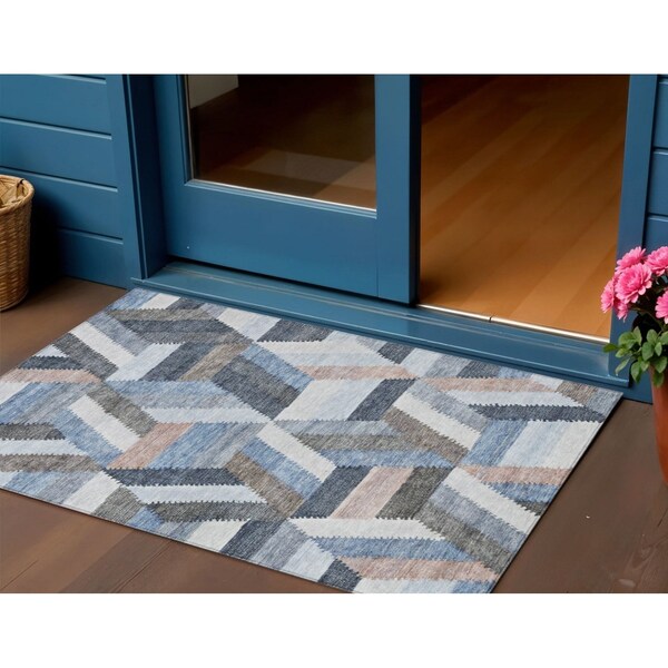 3' X 5' Blue Geometric Washable Indoor Outdoor Area Rug