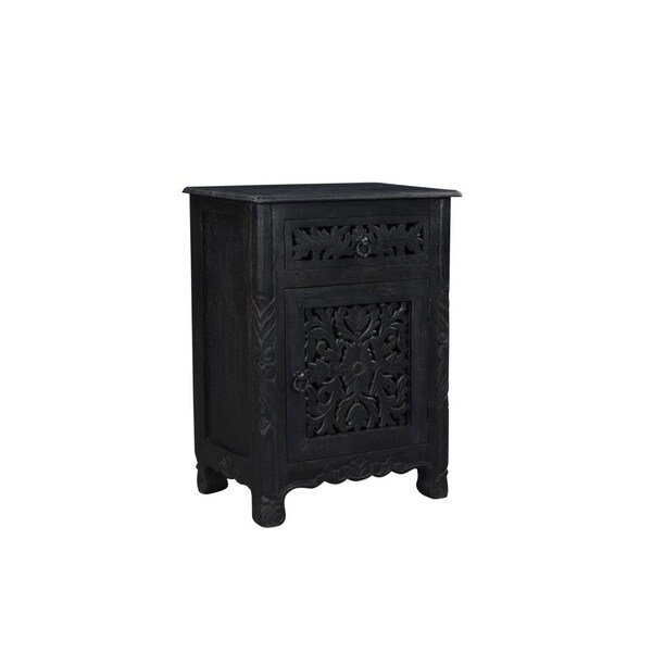 Good looking design and practical styling meet to form this 30-inch black solid wood distressed one drawer nightstand. Robust in design, the bed side table has been expertly crafted from solid wood. The easy open drawer allows you hidden storage to keep your essentials close at hand. An easy-access shelf gives you additional storage and display space. This piece is purposefully distressed to give a worn, rustic/vintage finish. The unsung hero of the bedroom, this nightstand is perfect for keeping a glass of water, lamp, alarm clock, jewelry, and more, close by and easily accessible. Nightstands are obviously great beside the bed but can be used just as easily to help battle clutter in your living room, hallway, office, or dining room. 30-inch h x 22-inch w x 15-inch d.