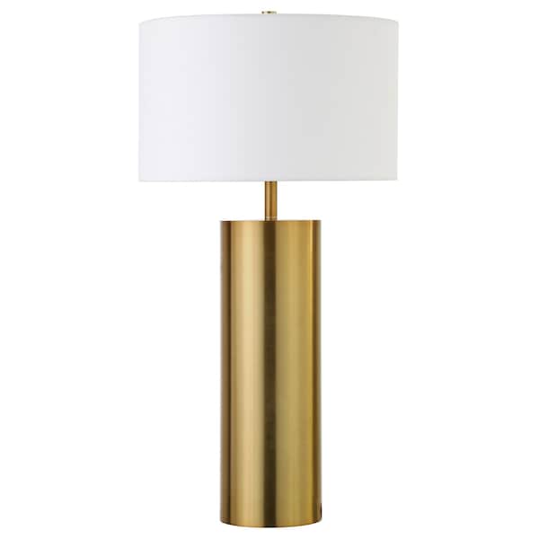 30" Brass Metal Table Lamp With White Drum Shade