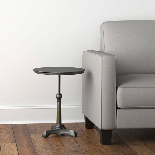 Distinctive in style the 30-inch brown iron round pedestal end table radiates a versatile charm. Made of cast iron, the brown coloration throughout gives this piece an updated and refreshing look. The purposefully distressed finish gives this table an authentically rustic and vintage style. An ideal location for placing your snacks and drinks, and a place to keep your lamp, frames, or other accessories. This versatile table is a great accent for most any room. 30-inch h x 24-inch w x 24-inch d.