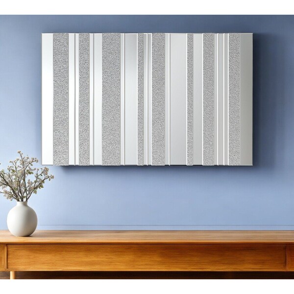 If you want to add some brightness to your living space, the 30-inch clear and silver unframed venetian accent mirror with faux crystals is perfect for you. This unique decorative frameless mirror will open up the room as it reflects the light beautifully from every angle. Dazzling stripes of faux crystal will add some luxurious and glamorous flair to your decor. Features quality craftsmanship in every facet that ensures durability and long-lasting wear. Add this exceptional quality mirror to your space for a beautiful reflection and a bit of elevated style. 29.53-inch h x 47.25-inch w x 0.79-inch d.