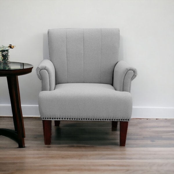 Unique and decorative, this 30-inch light gray and brown upholstered arm chair will leave a lasting impression. Built to last this arm chair is finished in solid light gray 100% polyester to give your room a great update. Giving the chair stability and structure, the inner frame is constructed with high quality solid and manufactured wood, includes comfy armrests, and features a fixed back that comes complete with soft and comfortable cushioning. Nailhead trim gives this chair a refined look that adds additional texture and visual interest. 35.4-inch h x 30.3-inch w x 27.6-inch d.