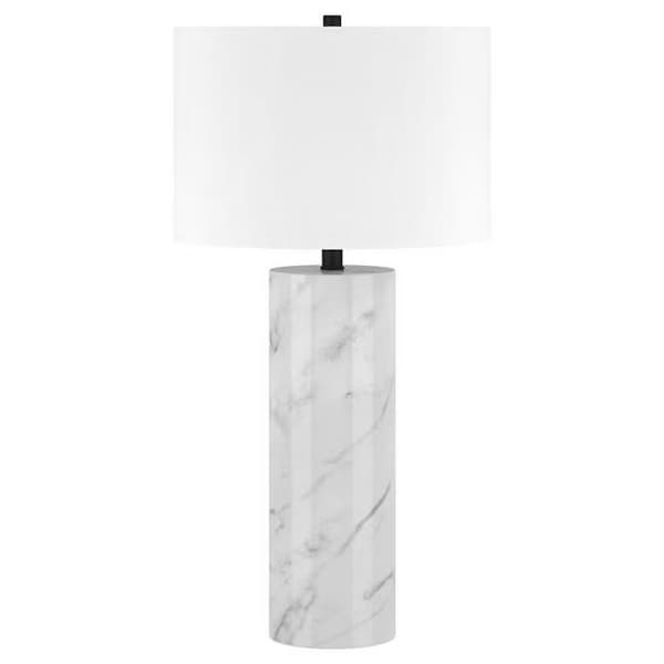 30" White and Gray Marble Table Lamp With White Drum Shade