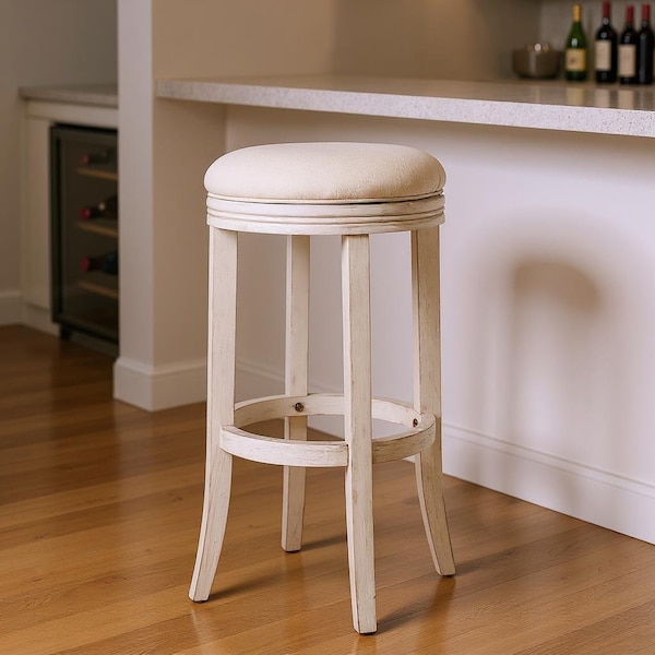 Comfortable enough to sit in for awhile, this 31-inch bone and antiqued white fabric and solid wood backless bar height swivel bar chair will transcend the look of your room. A antiqued white solid wood frame is finished off with a bone upholstered seat that is the epitome of quality construction and design. A backless mixed with a round shaped seat makes this chair both comfortable and fashionable. Designed with a footrest for comfort and convenience. Not only good looking and stylish, this chair features a round shaped seat and a backless for the ultimate in comfort and enjoyment. 30.5-inch h x 17.13-inch w x 17.13-inch d.