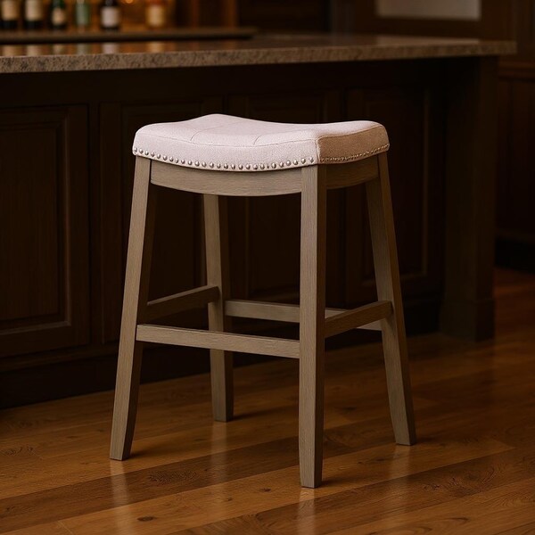 With this 31-inch gray and cool gray fabric and solid wood backless bar height bar chair you can add design and extra seating to your space. The gray upholstered seat of this stool is a nice contrast to the high quality, cool gray solid wood of the base. The saddle shape of the seat give this backless chair a fresh and fashionable look. Designed with a footrest for comfort and convenience. 30.7-inch h x 18.4-inch w x 20.2-inch d.