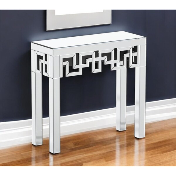 This 31-inch silver mirrored glass console table can provide a variety of practical functions such as providing extra storage space, serving as a display area for decorative items or acting as a catch-all for keys, mail, and other small items. This rectangular table features geometric pierced cutwork detailing. Glass reflects light more naturally than other materials, so this sparkling glass top will brighten up any room in your home. Versatile in use, console tables can be used for a variety of purposes in a variety of rooms and settings. 29.92-inch h x 31.49-inch w x 11.81-inch d.