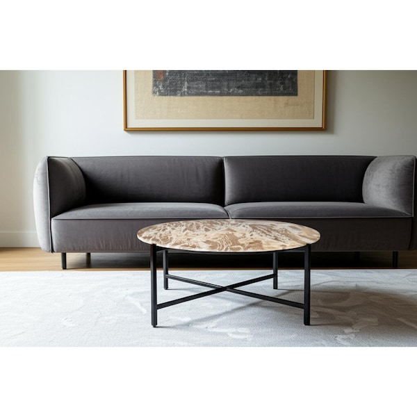 Make a statement with the 32-inch brown and charcoal genuine marble round coffee table and infuse a dash of character and personality into your space. If you're looking for something that can fit into a living area, bedroom, or office, this coffee table is for you. Its modern design harmonizes with a variety of interior styles, while the round top provides a welcoming feel. The sturdy four-legged base ensures stability and durability, making it a practical addition to any room. 17-inch h x 32-inch w x 32-inch d.